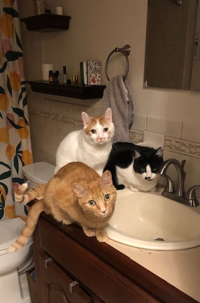 Just as Milo is very strange, Pumpkin is incredibly awkward. He has yet to understand how to snuggle and usually prefers to perch on my shoulder. Rescued with his brother, Milo, Pumpkin was a cute kitten with a big head who frequently pooped under my bed. He is extremely smart and knows the commands "sit", "paw" (puts his paw in my hand), and "other paw" (put his other paw in my hand). He is on Prozac, and makes squeaky chirp sounds.